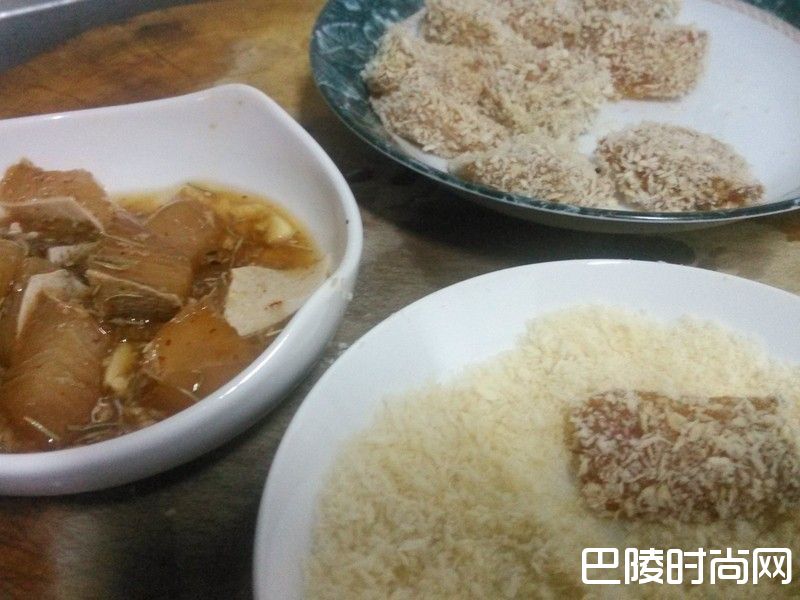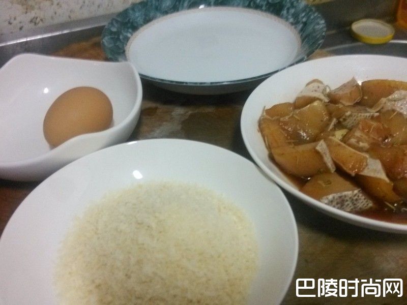 4取出暂置于冰箱醃好的鬼头刀鱼排,倒入装蛋清的碗中,让其均匀沾满蛋清,然后放到有面包粉的碟子,让表面全沾满,然后先放到干净的盘子上。