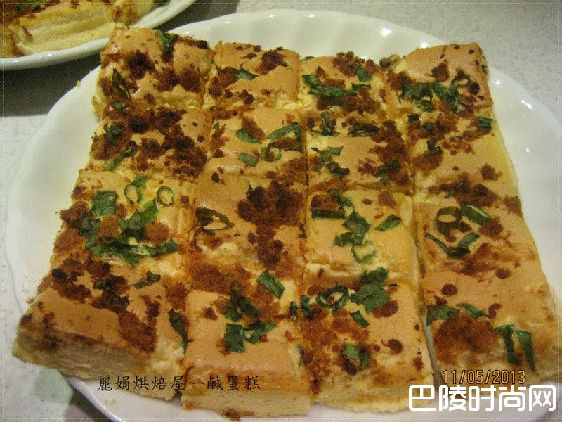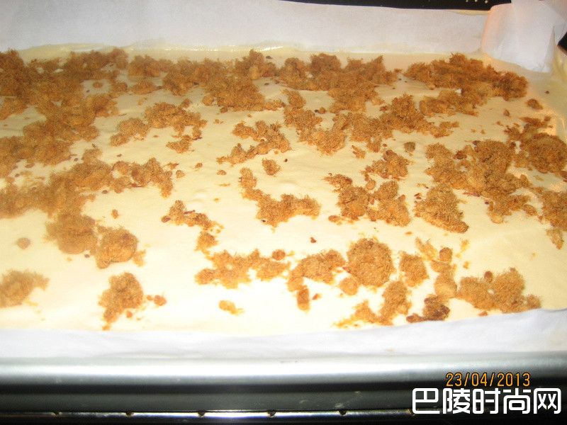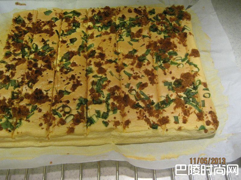 4将再面糊快速倒入铺纸的烤盘上,用刮板将表面抹平再撒上葱花及肉松,将烤盘轻敲数下,震出气泡,入烤箱。
