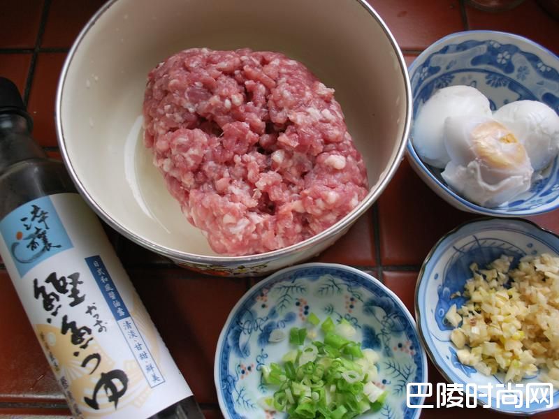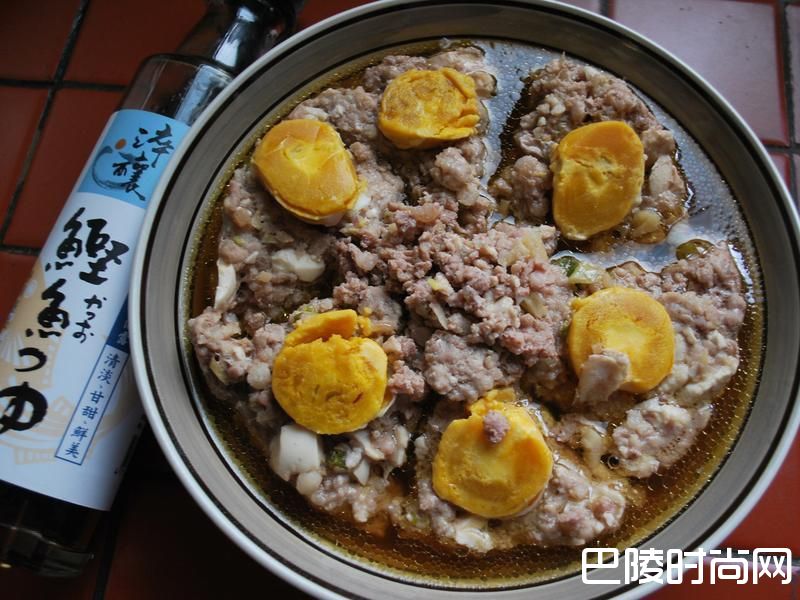 如图片,葱花、咸蛋三颗、姜末与蒜末、味全鲣鱼露。