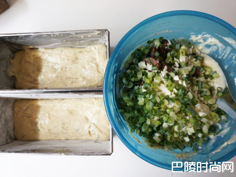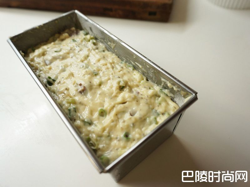 6先取适量步骤5铺在烤模底后,将青葱末、香肠、焗烤用cheese倒入咸蛋糕糊中拌匀。