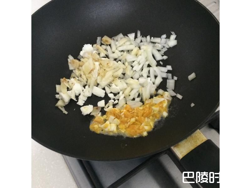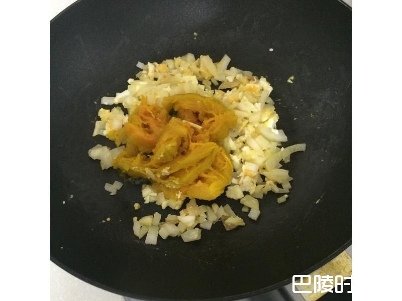4待洋葱软化且均沾上蛋黄,再加入南瓜泥拌炒,最后可以加入黑胡椒增添香味