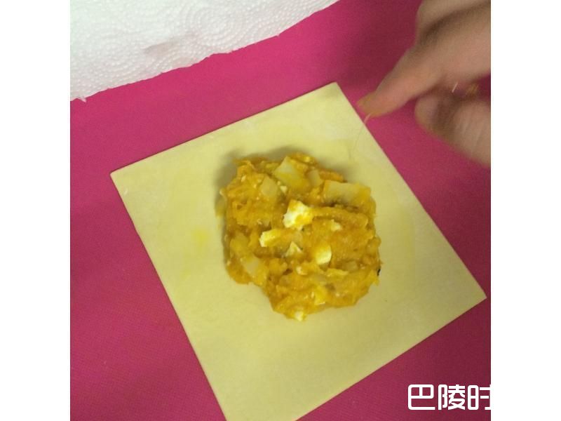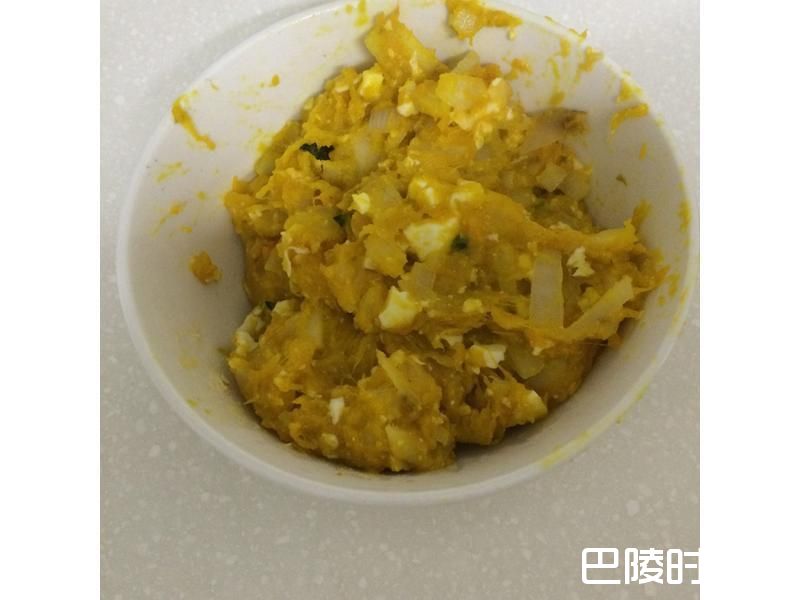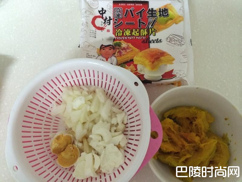 1将熟南瓜弄成泥,洋葱、荸荠切丁,咸鸭蛋剥壳分成蛋黄及蛋白