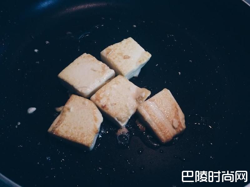 2鸡蛋豆腐切块后下锅,以小火慢煎至两面呈金黄色即可起锅。