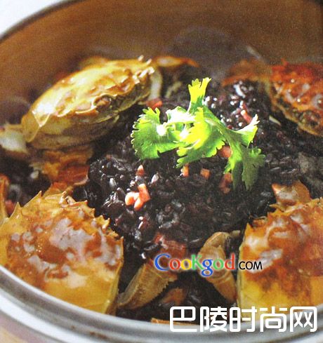 黑米蒸毛蟹活毛蟹4只,熟黑米150克,火腿末30克,青豆、香菇丁、冬笋丁、葱、盐、味精、胡椒粉、花生油各适量。