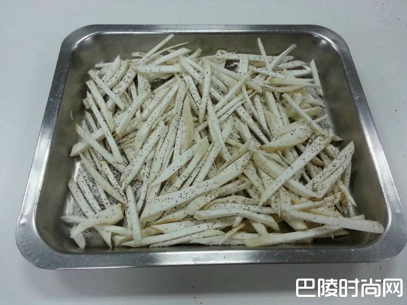 4步骤4将杏鲍菇丝平舖在烤盘,洒上少许的盐和黑胡椒粒
