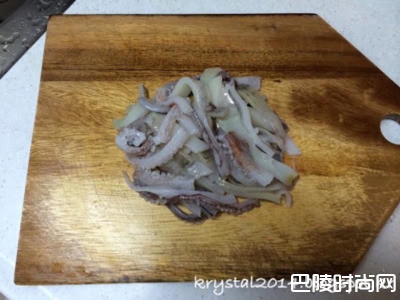 2将鱿鱼去除内脏彻底洗净,切成约一公分的条状。