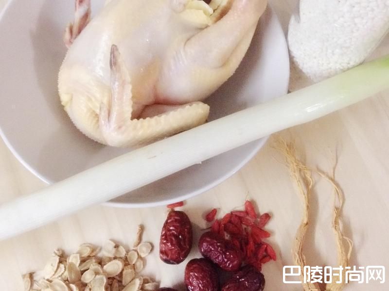 2处理食材。配料糯米洗净/人参、红枣去核和黄耆稍微用热水清洗/大葱切段。主要食材小母鸡-在鸡肚里放入糯米,肚口塞入2-3颗去核红枣后用牙签固定肚口(约塞8分满)。将鸡放入滚水锅里川烫去血水。