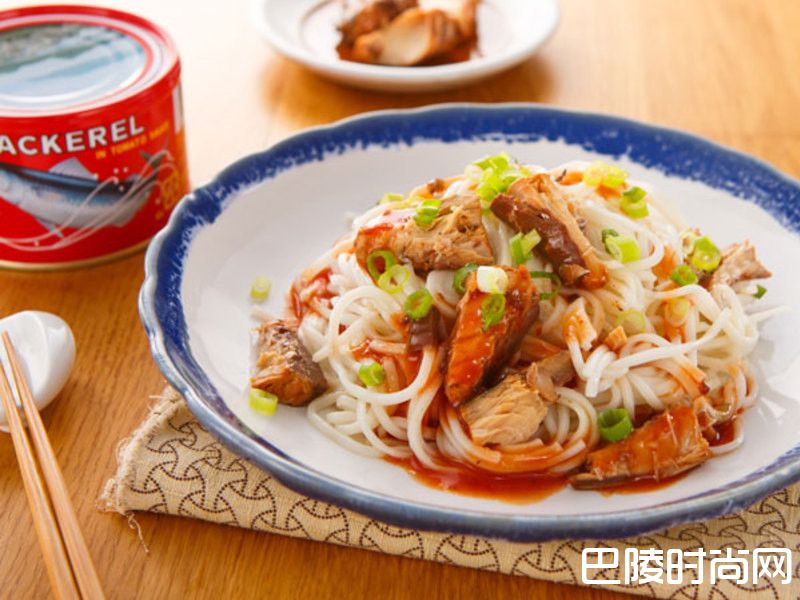 2打开茄汁鲭鱼罐头,取出一半的鲭鱼肉弄碎,把适量的茄汁鲭鱼汤汁淋到煮好的关庙面上,接着洒上鱼肉、葱花即可。不够咸的话,可再入少许酱油调味。