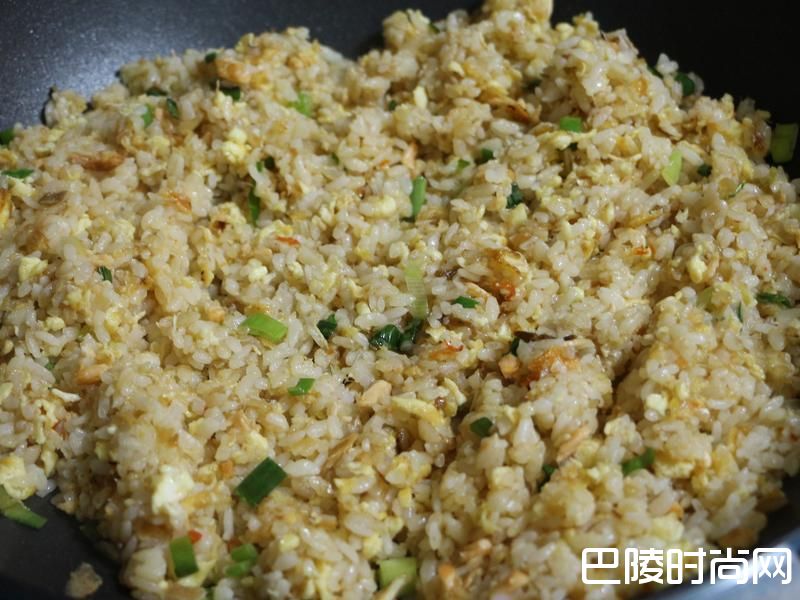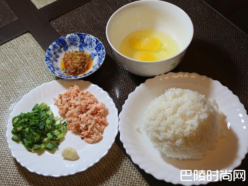 1备料:鲑鱼弄碎,干贝酱,青葱末,鸡蛋,白饭,蒜末
