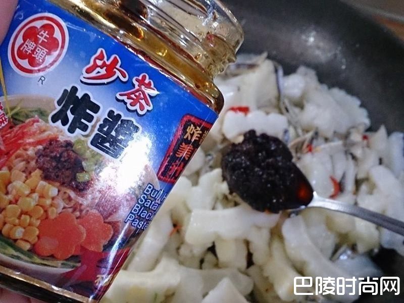 5接着加沙茶炸酱 炒香后加半杯热水