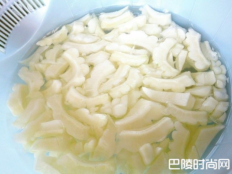 1苦瓜去籽去内膜切小块 泡一下盐水 或者滚水汆烫 (苦味来源是内膜 可以用刀子片干净)
