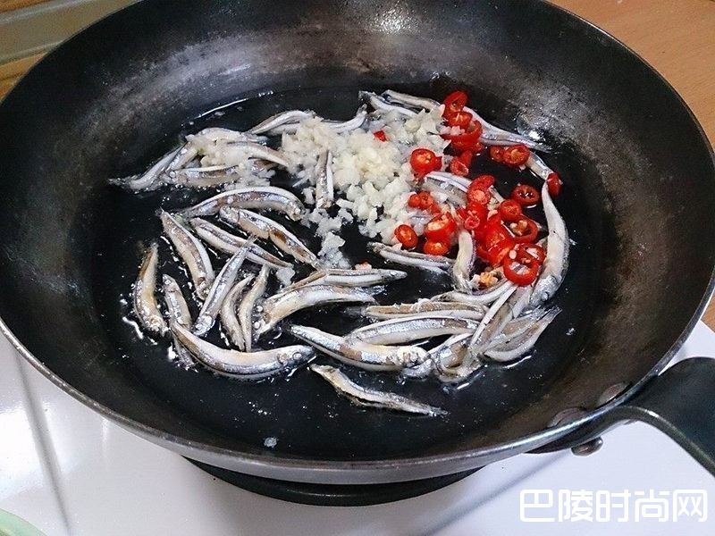 3热锅一大匙油 爆香小鱼干 再下姜末.蒜末.辣椒末炒香 (小鱼干也可以用油锅炸一下)