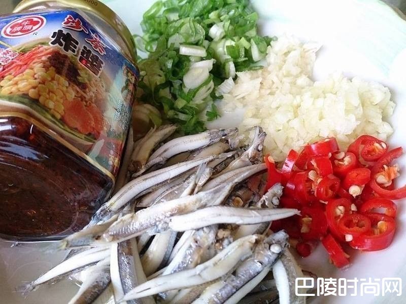 2其他备料~牛头牌沙茶炸酱.葱花.姜末.蒜末.辣椒末.小鱼干泡一下水再洗浄