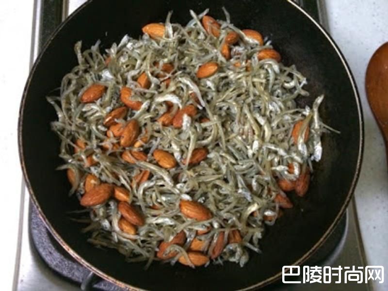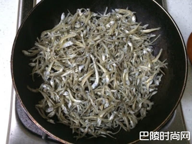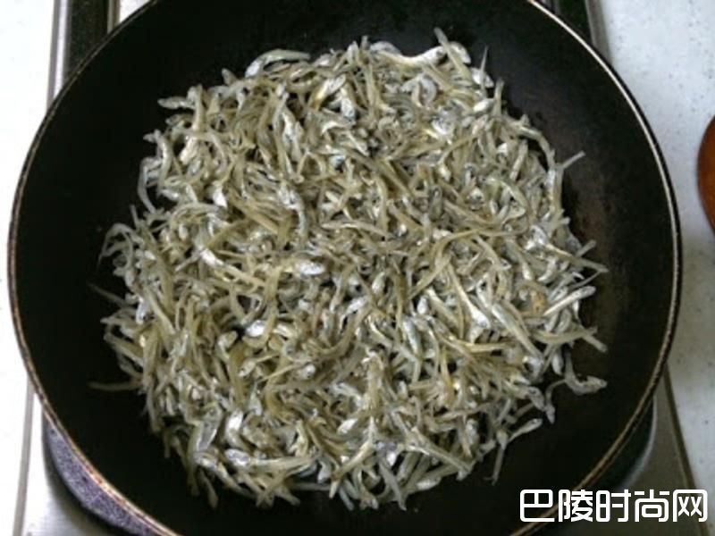 2小鱼干先用中火快速干炒过。因为我家的小鱼干是在市场买散装的,所以稍微用水冲洗过再炒干比较安心。