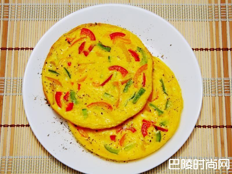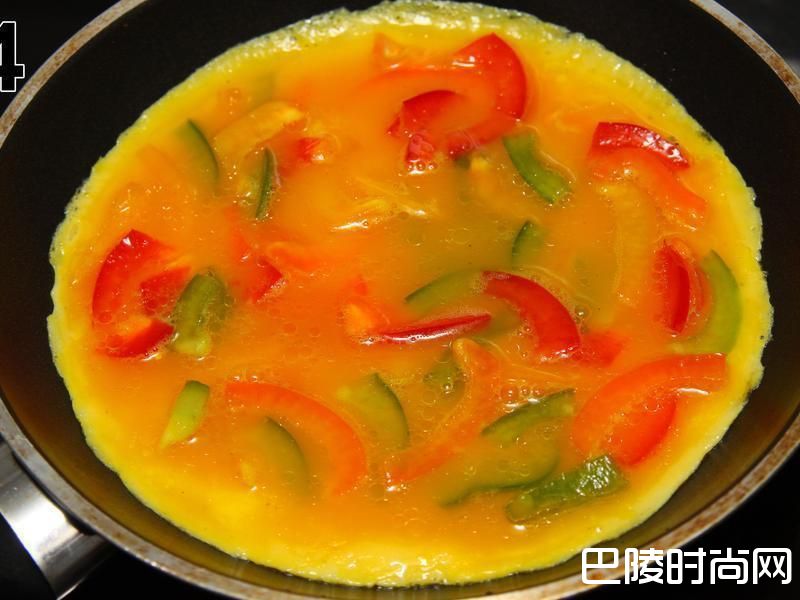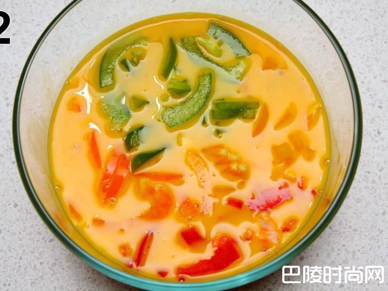 3彩椒切成小条状,加到蛋液中,随后加入调味料,拌匀;