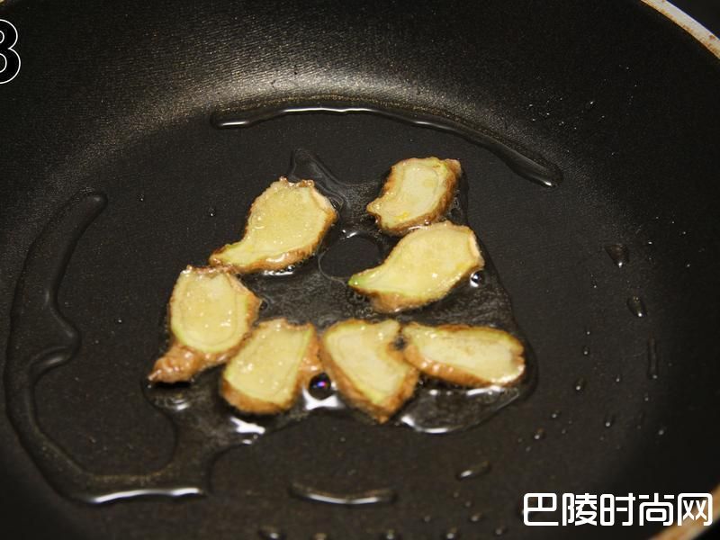 4适量油热锅,放姜片入锅慢火煎香,逼出姜味后,把姜片夹出来;