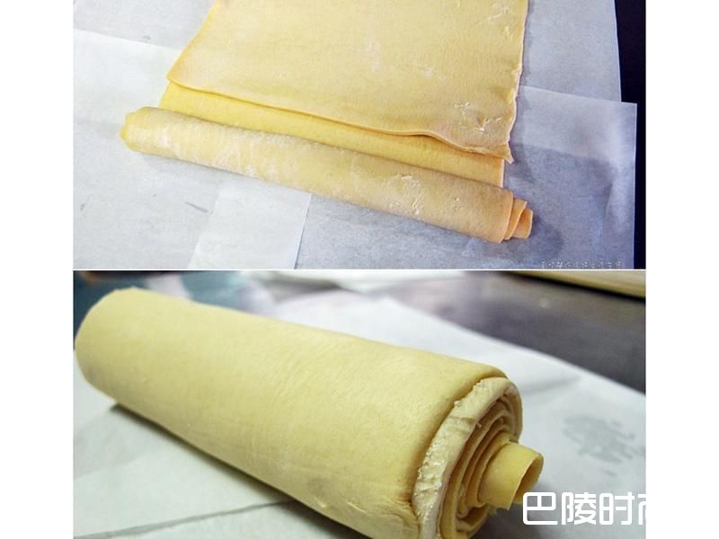 1起酥片退冰后保留末端重叠依序把8片卷成圆柱状