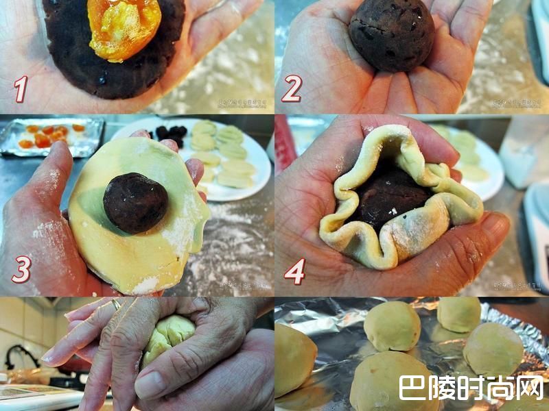 51 2) 红豆泥揉圆压平放上半颗咸蛋包起来再揉圆3 4 5) 擀平的酥皮放入揉圆的豆泥蛋黄馅,以虎口将边缘慢慢收紧6) 收口要压在底下操作4 5)时注意收紧圆周的面皮,馅料球状的部份尽量不要推拉以保外观的完整