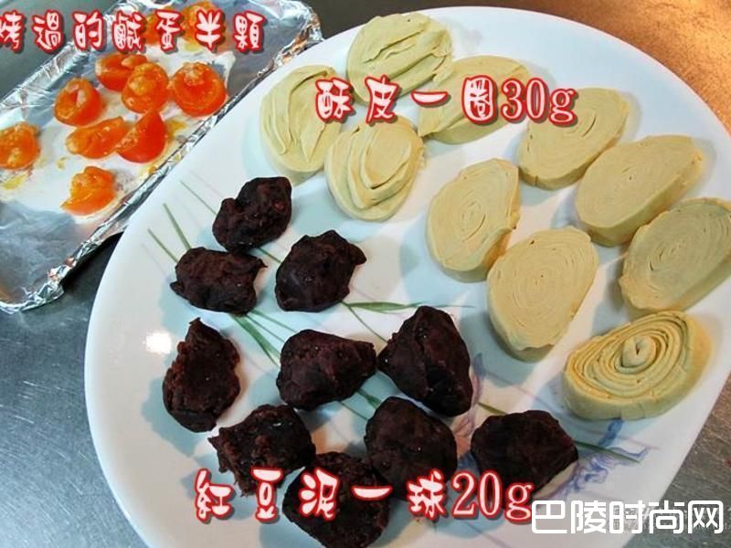 3 生鸭蛋黄对切喷点米酒(去腥),190度大约5~7分钟烤7分熟(蛋黄上有一点点冒泡就可以了,千万不能烤熟...会硬叩叩)。一颗蛋黄酥需要30g酥皮,20g红豆泥,半颗咸蛋黄。三项材料