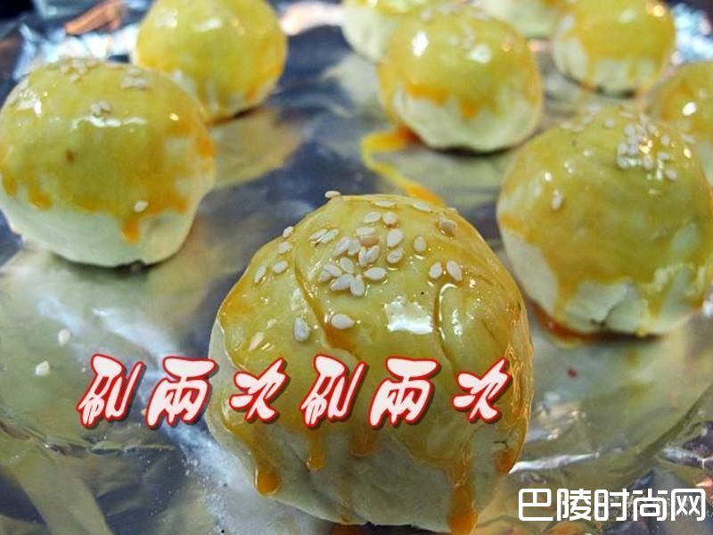 里的蛋黄喇散用刷子沾一点蛋黄液轻轻涂在完成的蛋黄酥上面