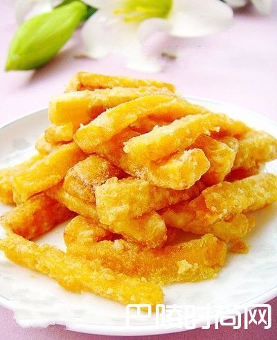 2、腌完的南瓜条要多放干淀粉,要是放少了炸过后南瓜会回软。