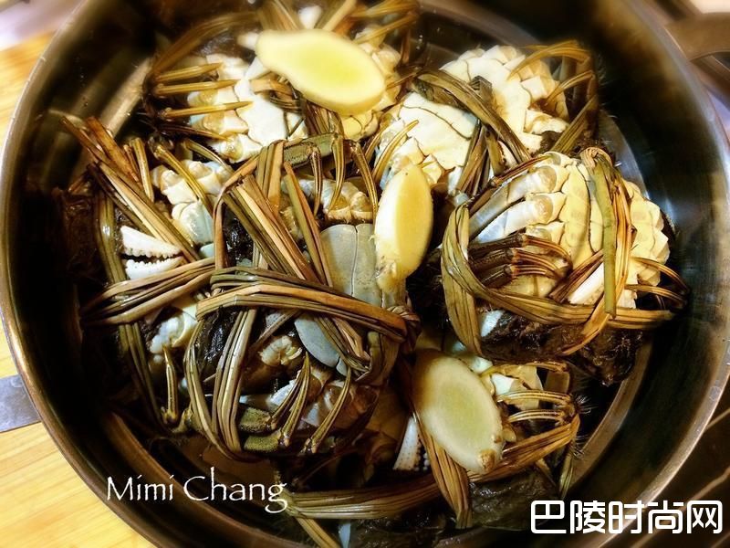 4不要剪掉蔺草,将大闸蟹腹部朝上放入蒸笼,蟹身上再放几片姜片。