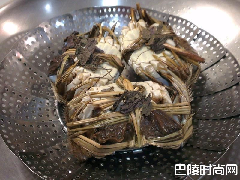 4准备锅子加入水等水煮沸腾后,再放入贴蒸网,再放入刷洗干净的大闸蟹,再放上紫苏叶,加上锅盖(中火蒸煮20分钟)