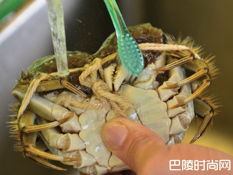 1以流动的水及牙刷轻柔刷洗大闸蟹的腹背。
