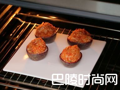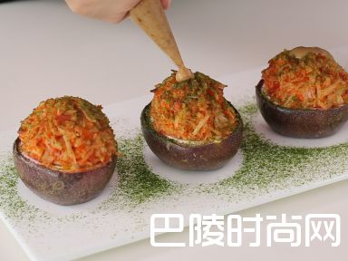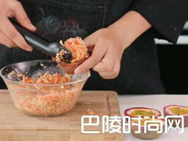 4将拌好的料,用冰淇淋勺子挖成小球,放在百香果上