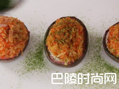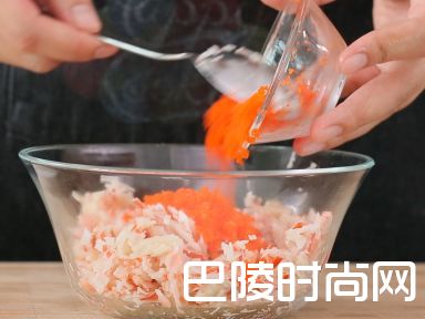 3蟹肉棒、蟹肉、30g沙拉酱、鱼籽、面包屑拌匀调成馅料