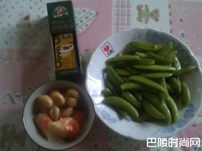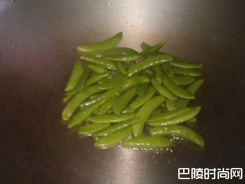 2倒入得意的一天橄榄油热锅, 放入甜豆略炒