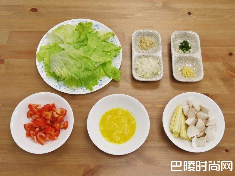 1步骤1:蛋打散成蛋液,蒜、姜与洋葱洗净切碎,巴西里切末,牛番茄和杏鲍菇洗净切块,玉米笋洗净对切,莴苣洗净并分成片状备用。