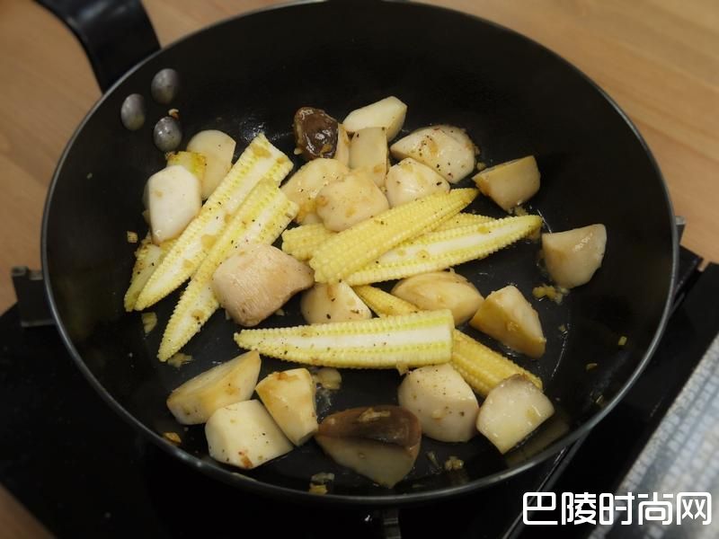 2步骤2:将吐司放进蛋液中浸泡,取炒锅放入奶油热锅,加入蒜末炒香后,放入杏鲍菇与玉米笋拌炒至表面焦黄,撒上1小匙黑胡椒粉取出备用。