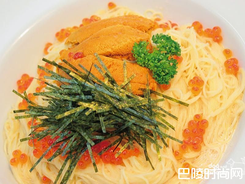 4呈盘后放上海胆、鲑鱼卵并洒上海苔丝。