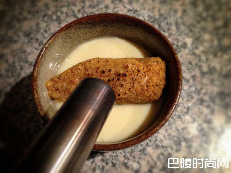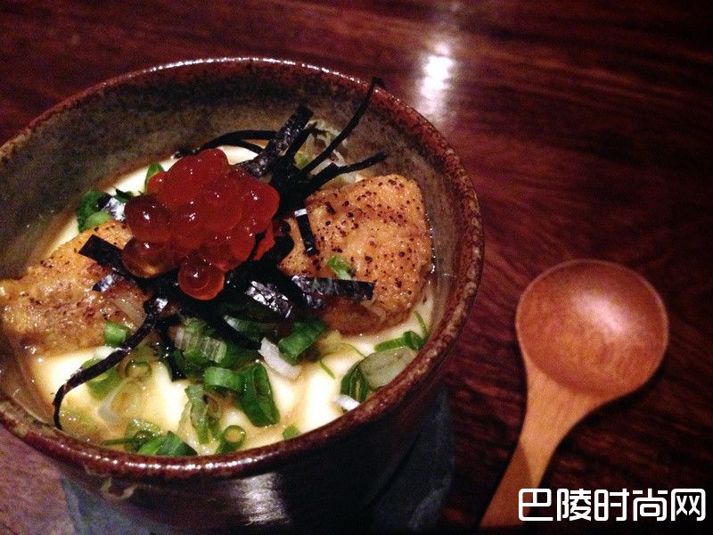 6取出蒸蛋前,以小汤匙背轻压测试,确认蒸蛋熟了才取出。再放入海胆,以喷枪确实将海胆烧炙出焦色。
