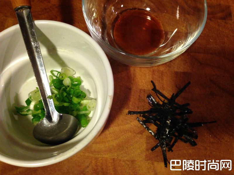 7先淋上一点酱汁,再洒葱花与海苔丝,最后摆上鲑鱼卵。