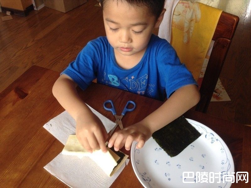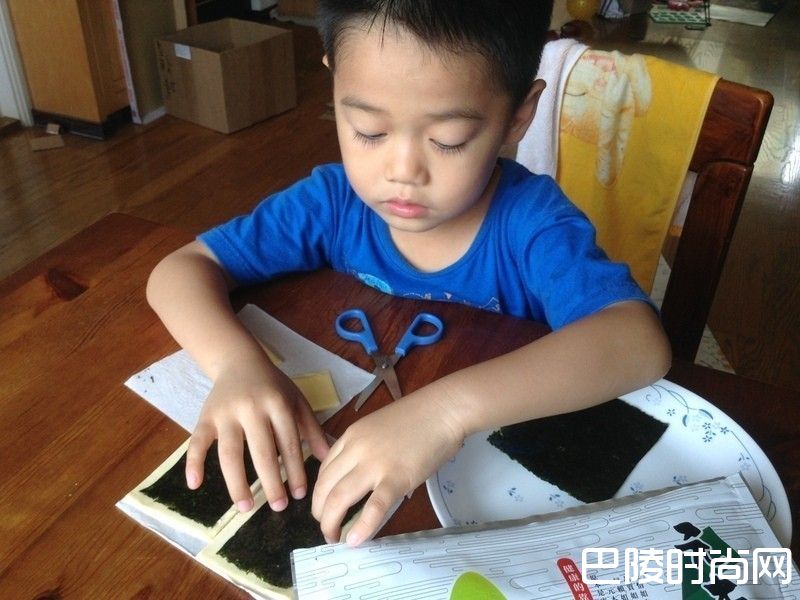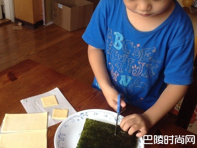 2起酥片切一半备用。起司片也切一半备用。元本山味付对切海苔用剪刀剪成四分之一的大小两片,剩下的另一半就可以吃掉囉!(小孩很爱边做边吃想吃的)