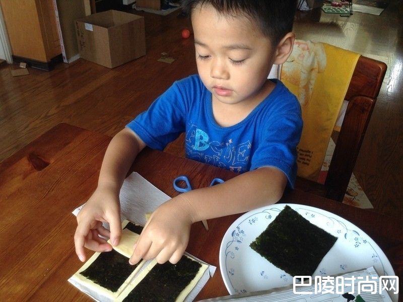 3将海苔平铺在起酥片上。