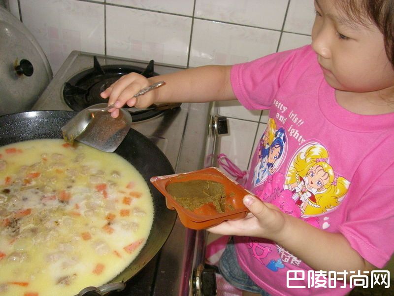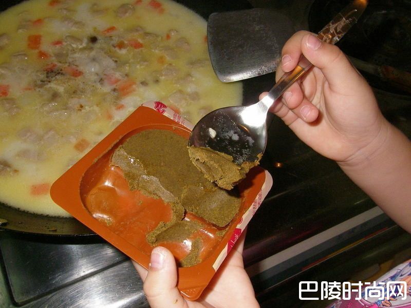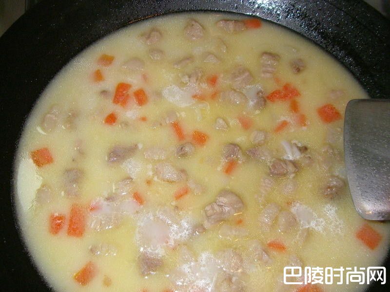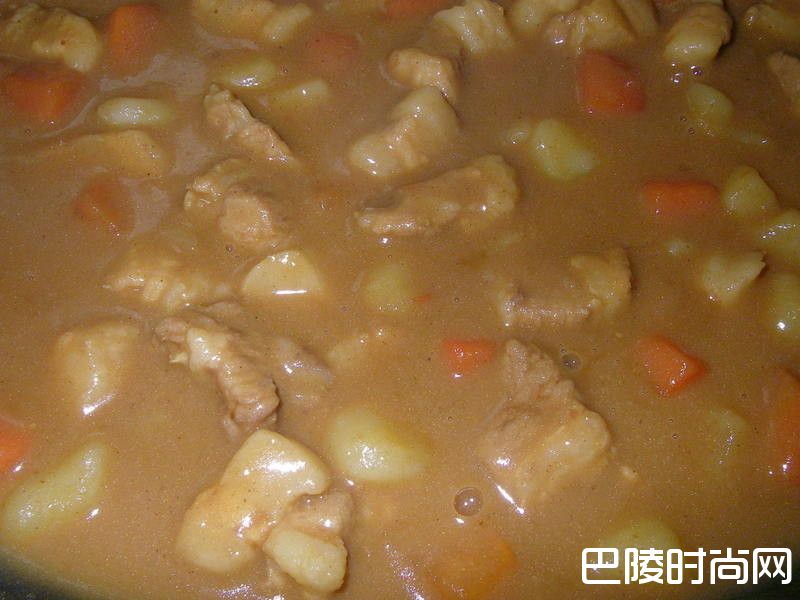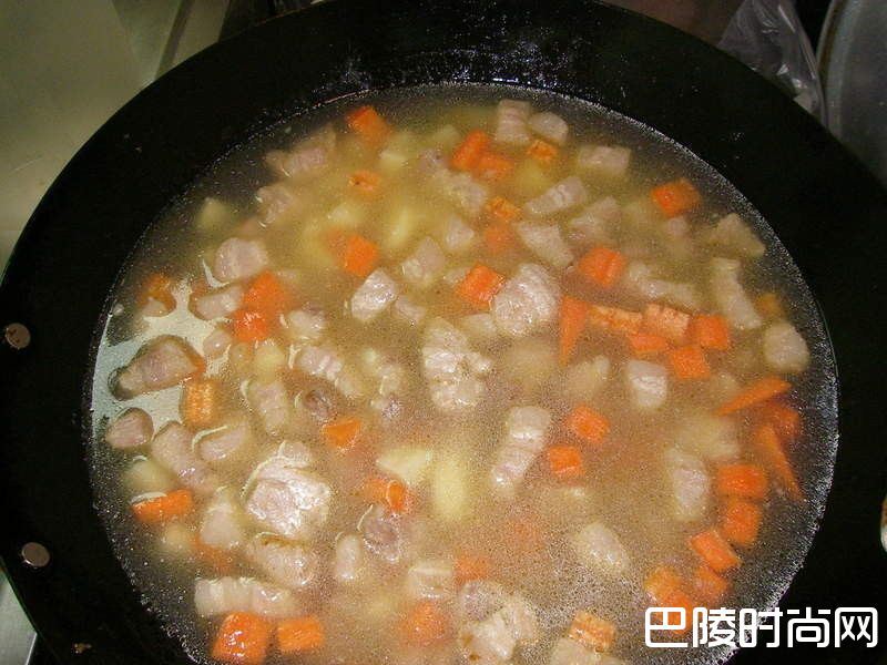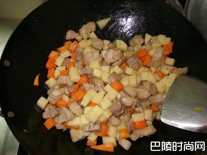 2将梅花肉先入锅炒熟,再放入马铃薯及红萝卜