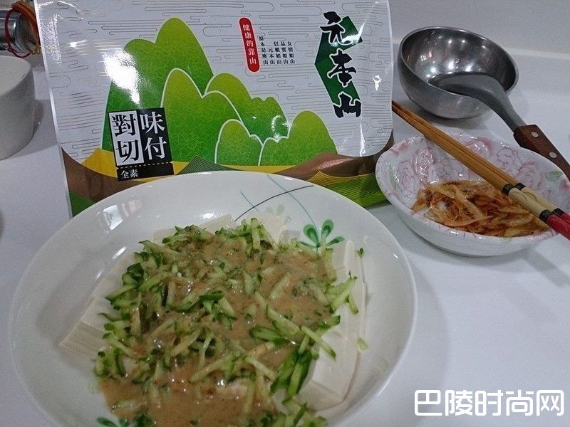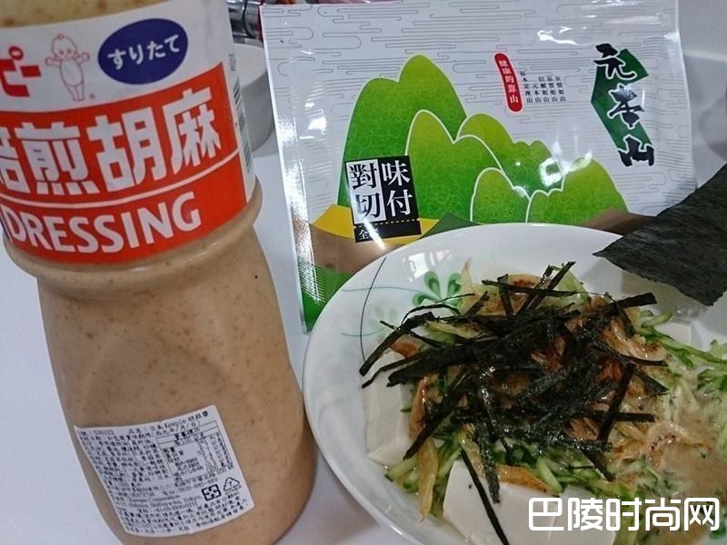 3配料豆腐铺底,加上配料小黄瓜,放上配料樱花虾,淋上调味料胡麻酱,最后摆上元本山海苔丝