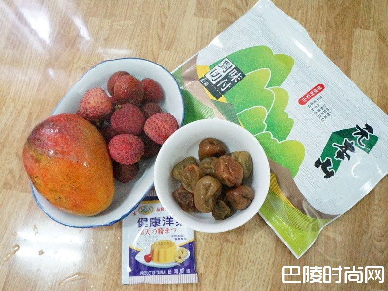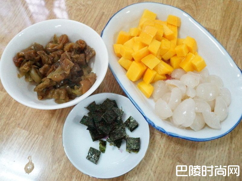 2芒果、荔枝去皮去芓切丁,梅子去芓切丁,海苔切丁。