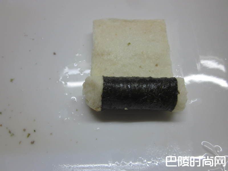 5海苔朝外,由下往上卷紧,到收口处用力压一下