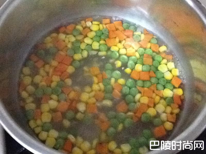 4另备一小锅水,煮沸后放入冷冻综合蔬菜(红萝卜、玉米、碗豆仁)烫约30秒,捞起滤掉水份,备用。