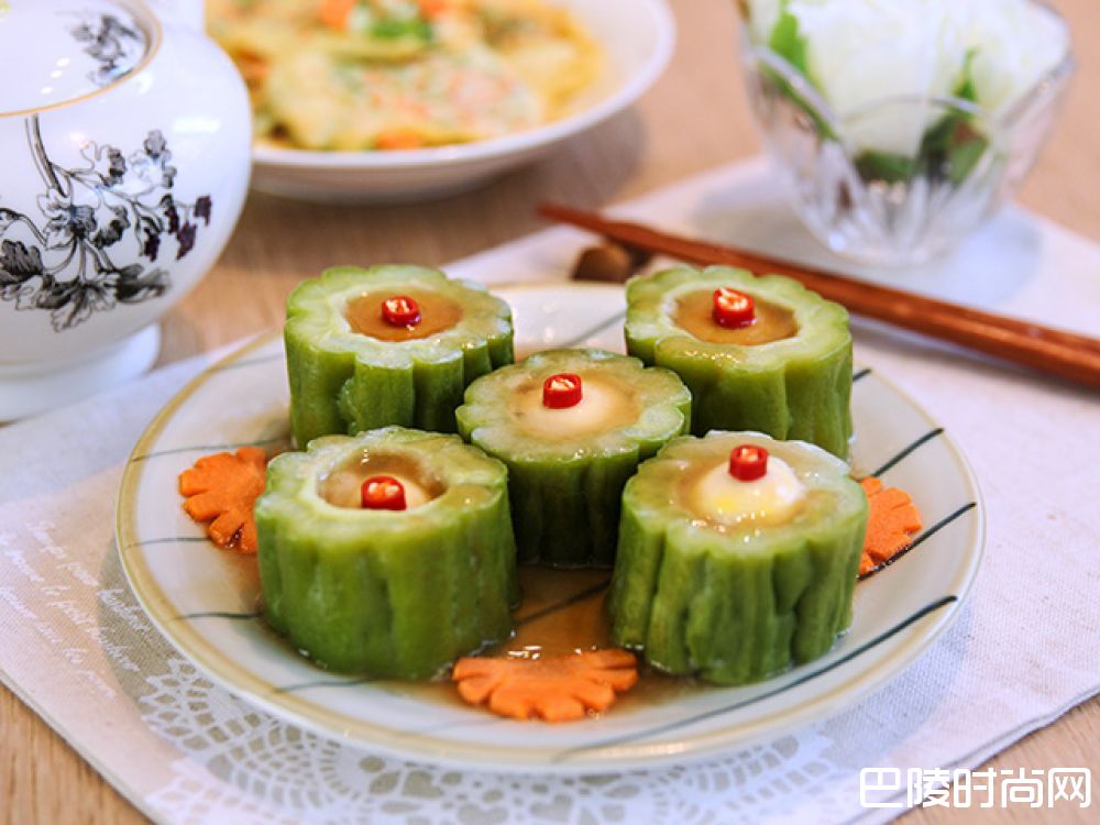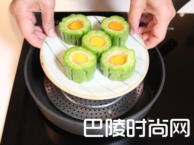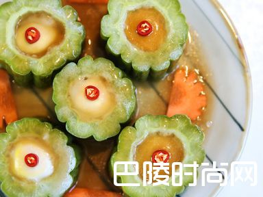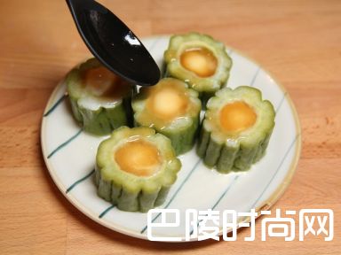 5将蚝油酱汁淋在蒸好的苦瓜上
