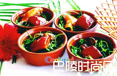 3、取高压锅放入肉块、花雕酒、白糖、酱油、南乳汁、葱、姜、老抽,上大汽后压15分钟至酥烂,取出肉块,置入紫盆中。另起锅入甲鱼块,用肉汁原卤小火烧20分钟至软糯取出,放入盆内。锅内放底油烧至六成热,下入草头大火炒透后伴边,原汁勾薄芡浇上即可。