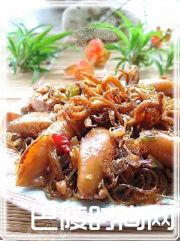 5.下香葱.这道菜是偏咸的客家味.我最后加了把粉丝去吸汁.因为儿子不喜欢太咸的菜.配料要多.而且比鱿鱼更下饭.