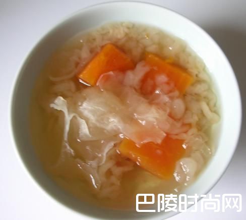 3、先煮银耳约一小时,放姜片,再放雪蛤木瓜、冰糖,同煮一小时后即可。