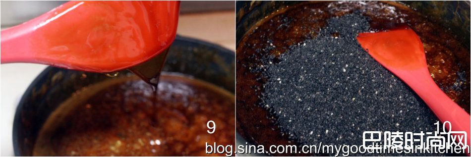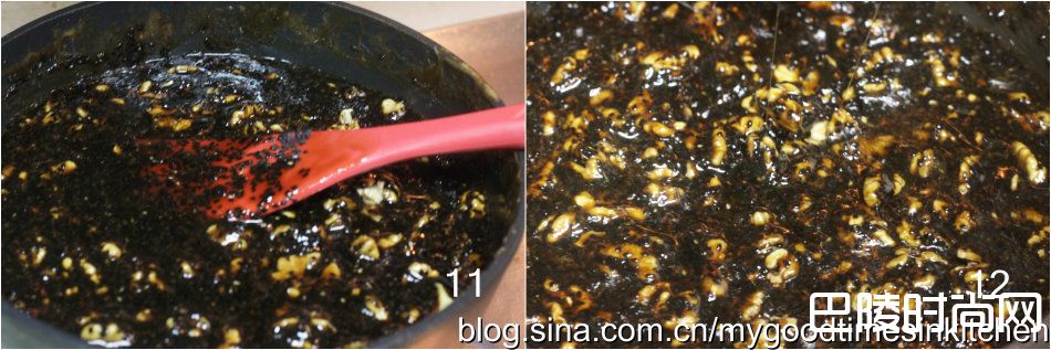 7、挂旗后,倒入黑芝麻、核桃仁,快速翻拌均匀,立刻出锅;