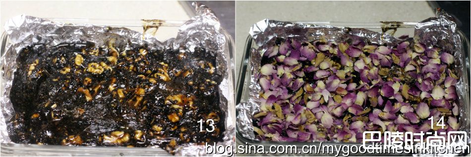 8、出锅后,铺上一层玫瑰花瓣,趁热用手指整理压平,静置一夜即可脱模,切成10g/块左右,冷藏保存,每天1块。