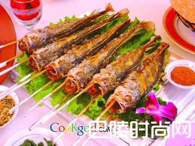 2、用竹签子将黄花鱼串起来,放入韩式烤炉内中火烤20分钟,取出装盘,跟蘸料上桌。